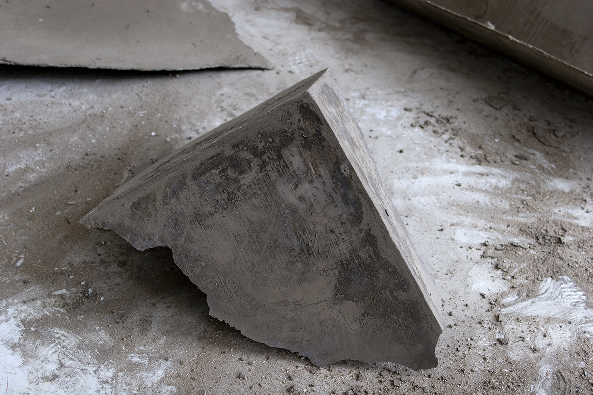 The shape and the surface of the concrete structures communicate contradictory messages; the concrete surfaces radiate strength and reliability, while in their form they are very fragile, being only a few centimetres thick. The prints on the wall are a Google Street View image of the surface of the sea above its deepest point.